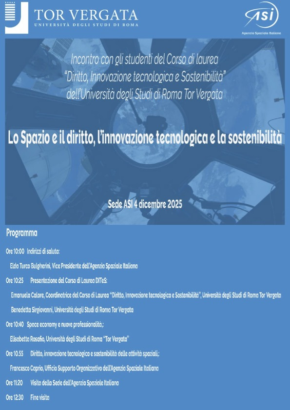 Lo spazio e il diritto, l’innovazione tecnologica e la sostenibilità. ASI 4 dicembre 2025 Emanuela Calore Avvisi, Eventi 1 Dicembre 20251 Dicembre 2025